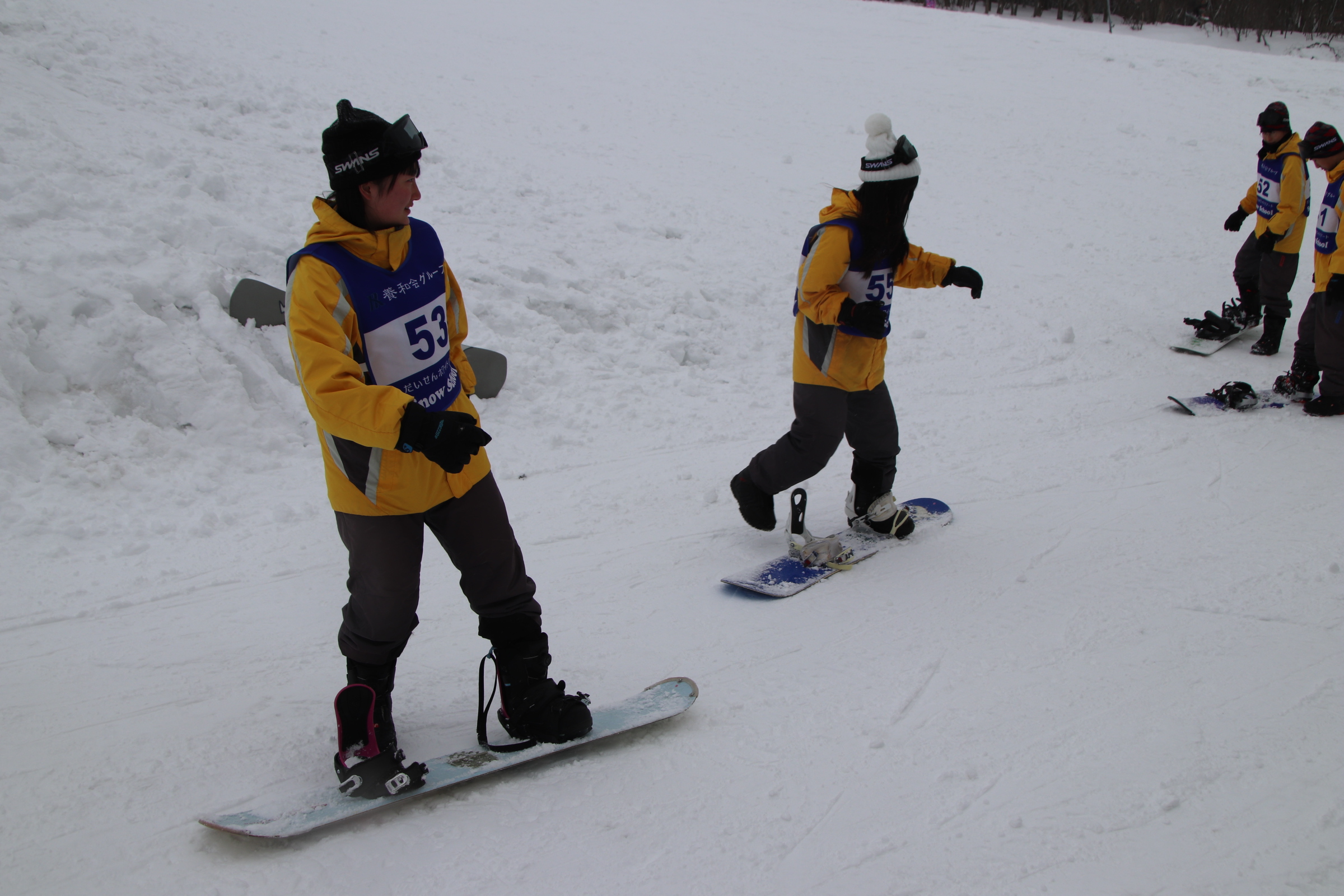 初日は雪が舞っている中、インストラクターの方々から丁寧な指導を受け、生徒たちはスキー・スノーボードの技術向上に一生懸命取り組んでいました。初めて挑戦する生徒も多く見られましたが、仲間同士で声を掛け合いながら、前向きに活動する姿が印象的でした。
